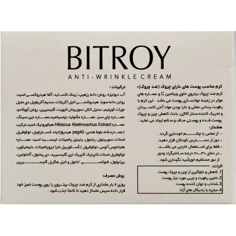 کرم ضد چروک بیتروی، محصولی تخصصی و موثر برای مبارزه با علائم پیری و بازگرداندن جوانی و شادابی به پوست شماست. این کرم با فرمولاسیون پیشرفته و حاوی ترکیبات فعال ضد چروک، به تحریک کلاژنسازی و الاستین در پوست کمک کرده و به طور چشمگیری خطوط ریز، چین و چروکها و افتادگی پوست را کاهش میدهد. استفاده منظم از این محصول به افزایش استحکام و قابلیت ارتجاعی پوست کمک کرده، باعث لیفتینگ ملایم میشود و به پوست شما ظاهری صافتر، سفتتر و جوانتر میبخشد. بافتی غنی اما با جذب مناسب دارد که رطوبت مورد نیاز پوست را نیز تامین میکند. برای تجربه پوستی جوانتر و صافتر، این محصول را از سالی مارکت با آدرس
