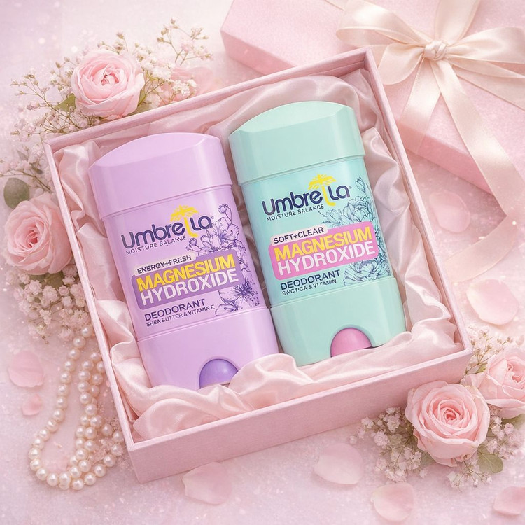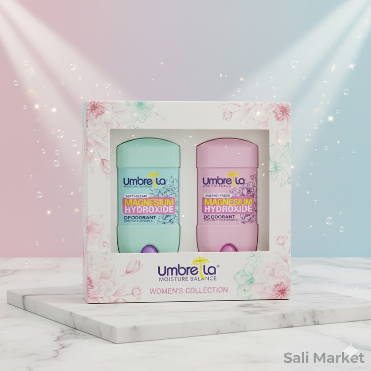 این پک شامل دو استیک دئودورانت پرطرفدار آمبرلا، مدلهای Energy+Fresh (صورتی) و Soft+Clear (سبز) است که به طور اختصاصی برای استفاده روزانه بانوان طراحی شدهاند. این استیکها با فرمولاسیون فاقد الکل و آلومینیوم، ضمن محافظت ۲۴ ساعته در برابر بوی ناخوشایند عرق، به حفظ رطوبت و نرمی پوست ناحیه زیربغل کمک میکنند. ویژگیهای مشترک: فرمولاسیون: ژل دئودورانت استیکی. ماندگاری: ۲۴ ساعته. ترکیبات کلیدی: حاوی روغن نارگیل، شی باتر، ویتامین E، منیزیم هیدروکسید و زینک (روی). مزایا: ضد حساسیت، ضد باکتری، جذب سریع، و سازگار با انواع پوست. مزیت ویژه: کمک به روشن شدن و رفع تیرگی زیربغل (به دلیل نداشتن آلومینیوم و وجود مواد نرمکننده). کشور مبدأ برند: ایران (صادرکننده مجوز: سازمان غذا و دارو).
